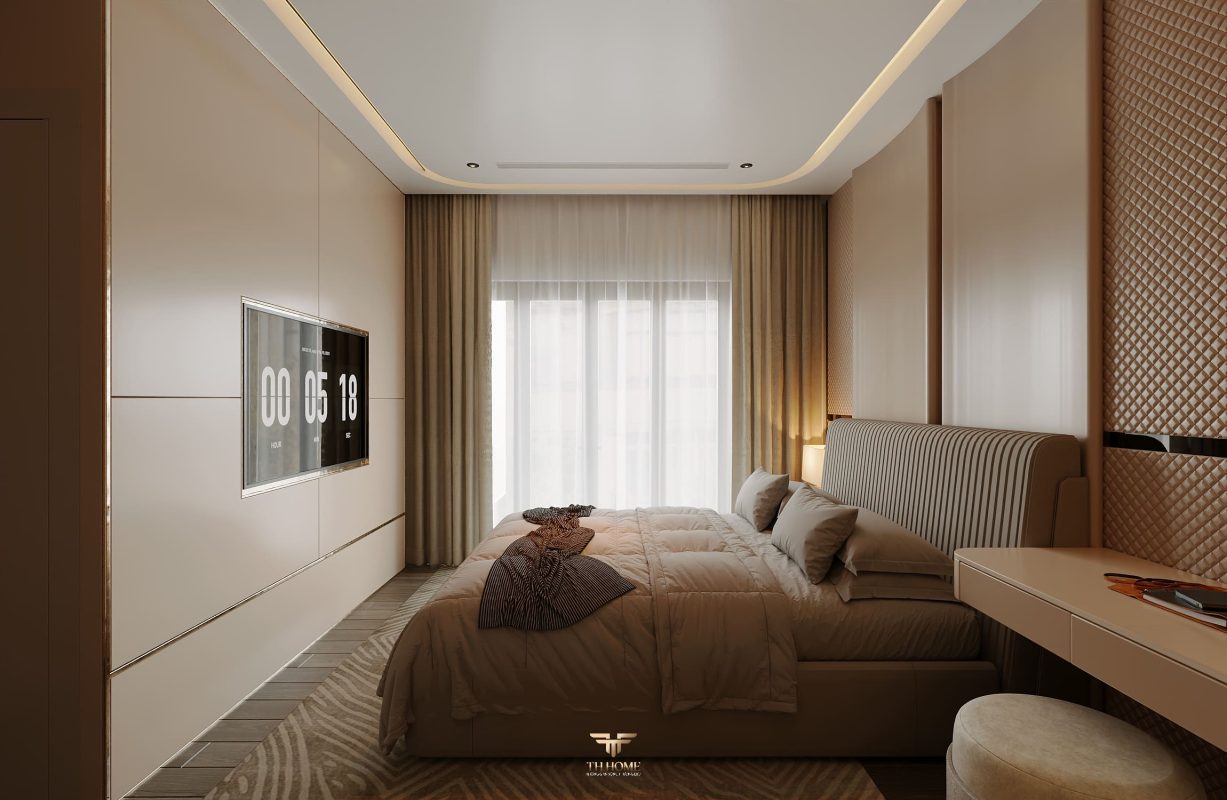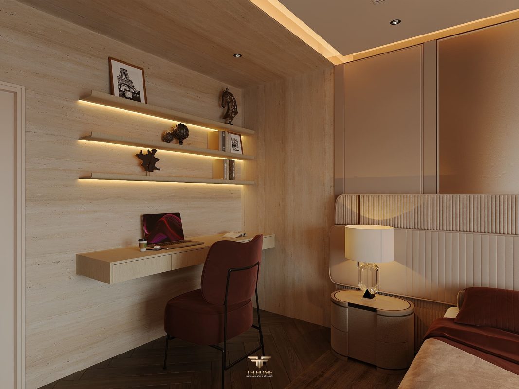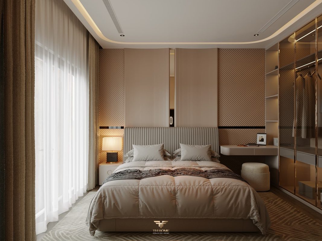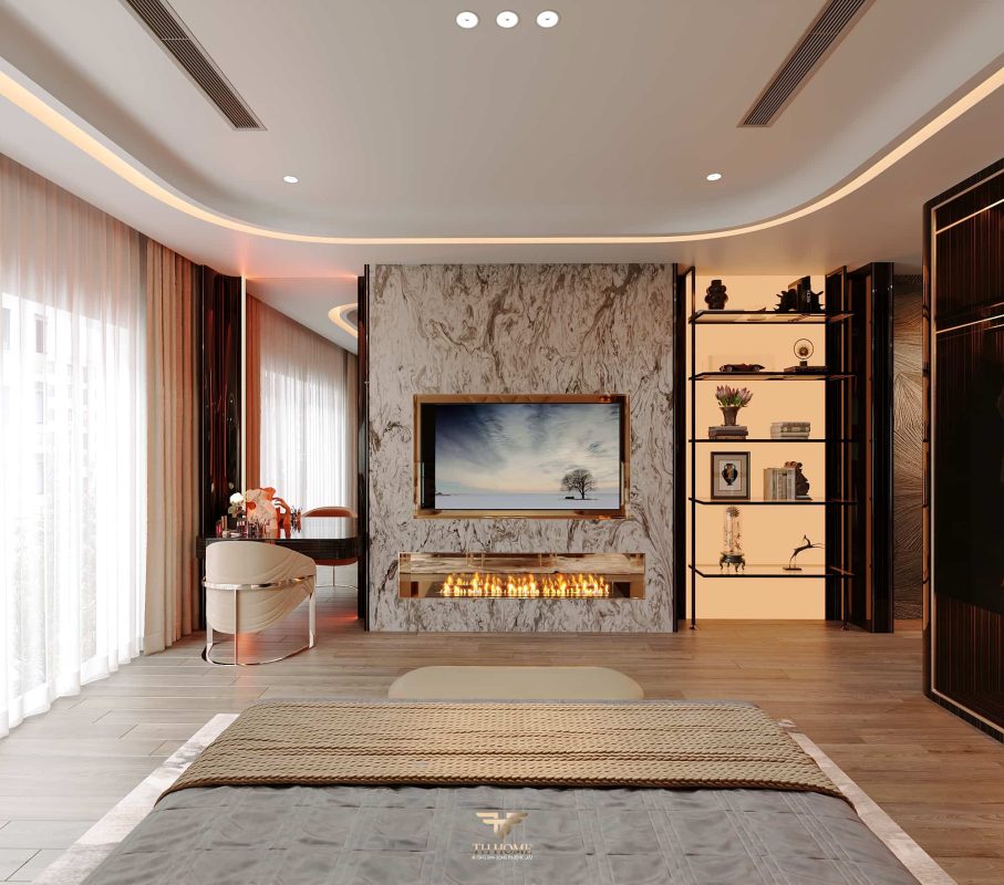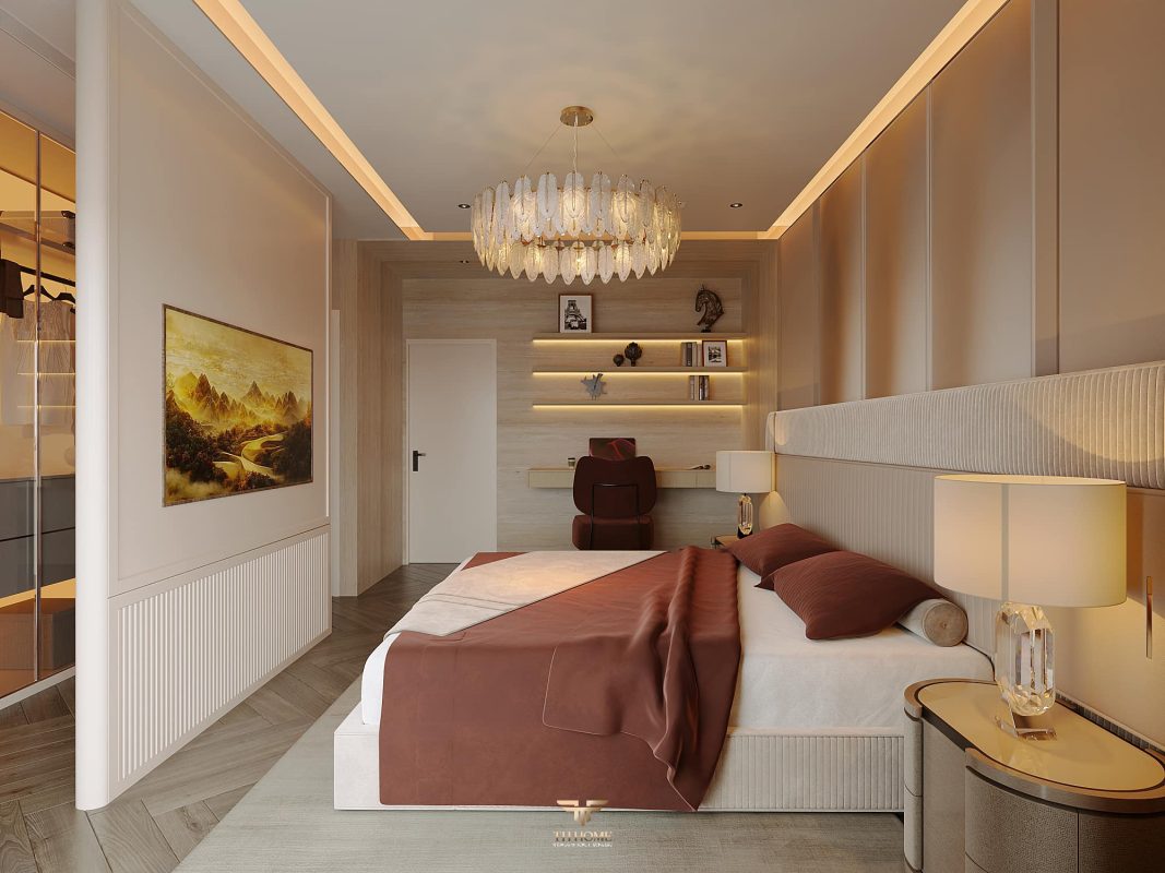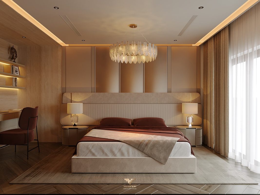 Không gian được thiết kế cá nhân hóa, phòng khách thông tầng được nâng tầm với vách đá xuyên sáng cùng đèn chùm pha lê, như một điểm nhấn nghệ thuật đầy kiêu hãnh. Khu bếp hiện đại, sang trọng giữ lửa yêu thương. Phòng ngủ ấm cúng, chỉn chu – nơi gia chủ tìm lại sự an yên sau mỗi ngày dài.