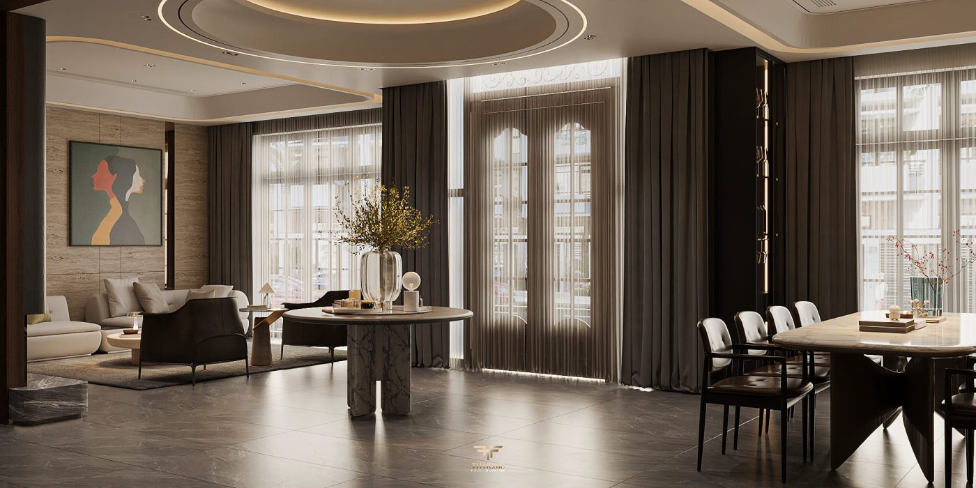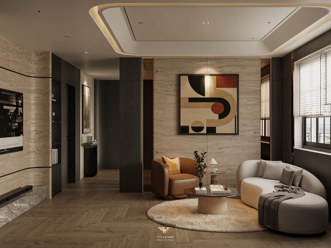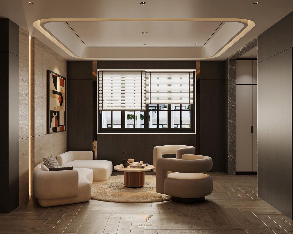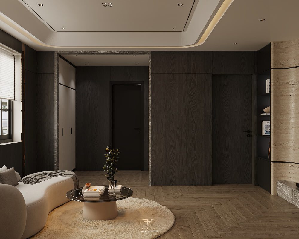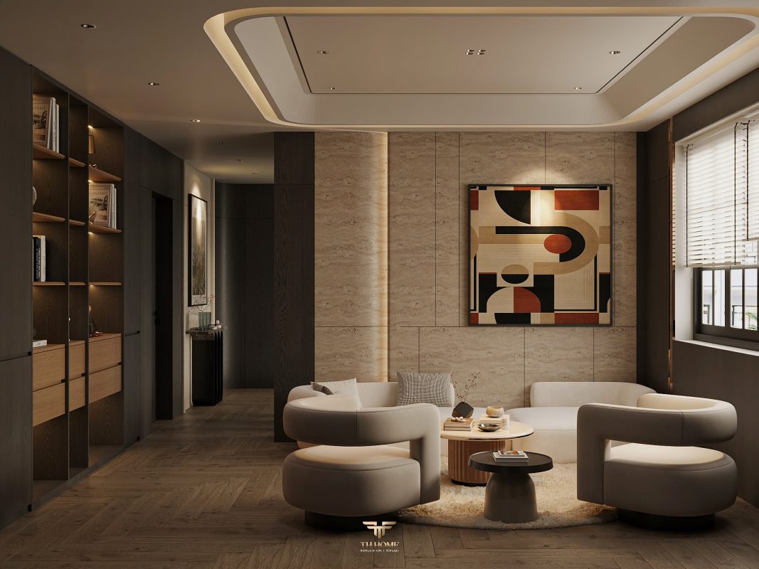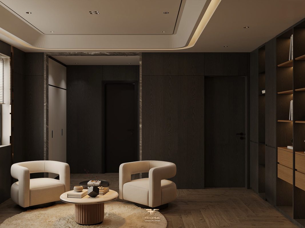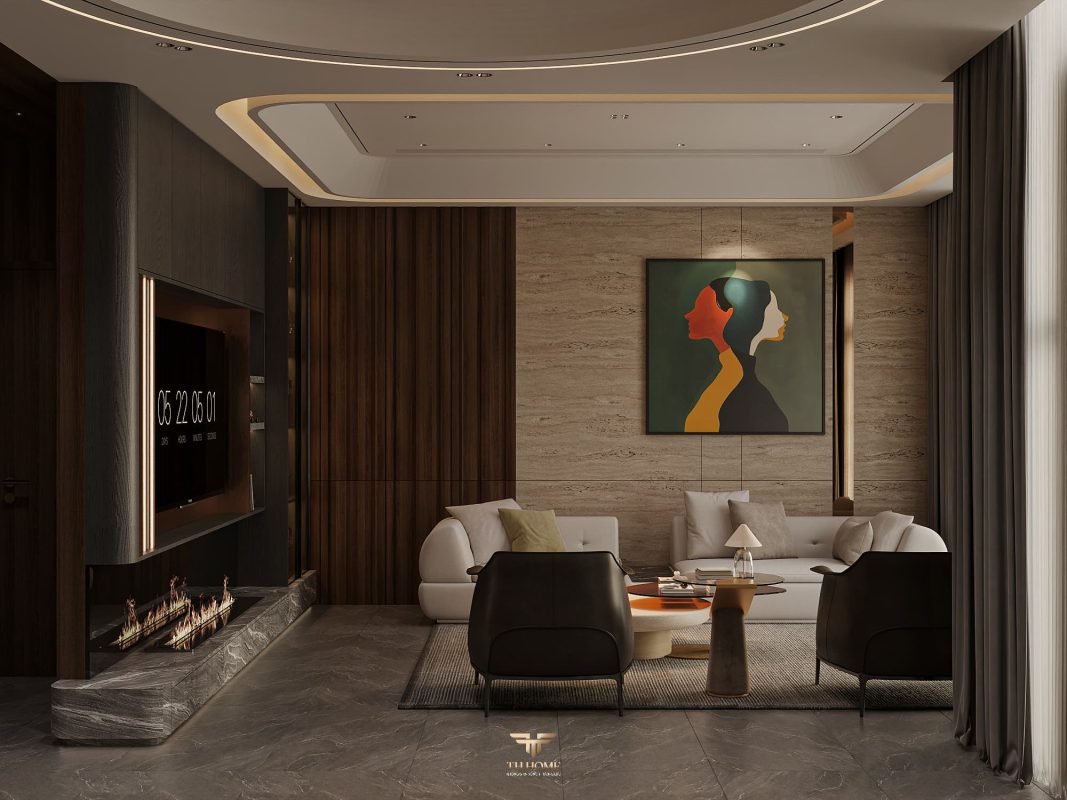 Không gian ấn tượng với tone màu trầm chủ đạo. Từng chi tiết từ trần thạch cao bo cong, hệ thống chiếu sáng cho đến cách bố trí nội thất đều được cân nhắc kỹ lưỡng để tạo nên tổng thể hài hòa: ấm áp, thư thái mà vẫn sang trọng và nghệ thuật.