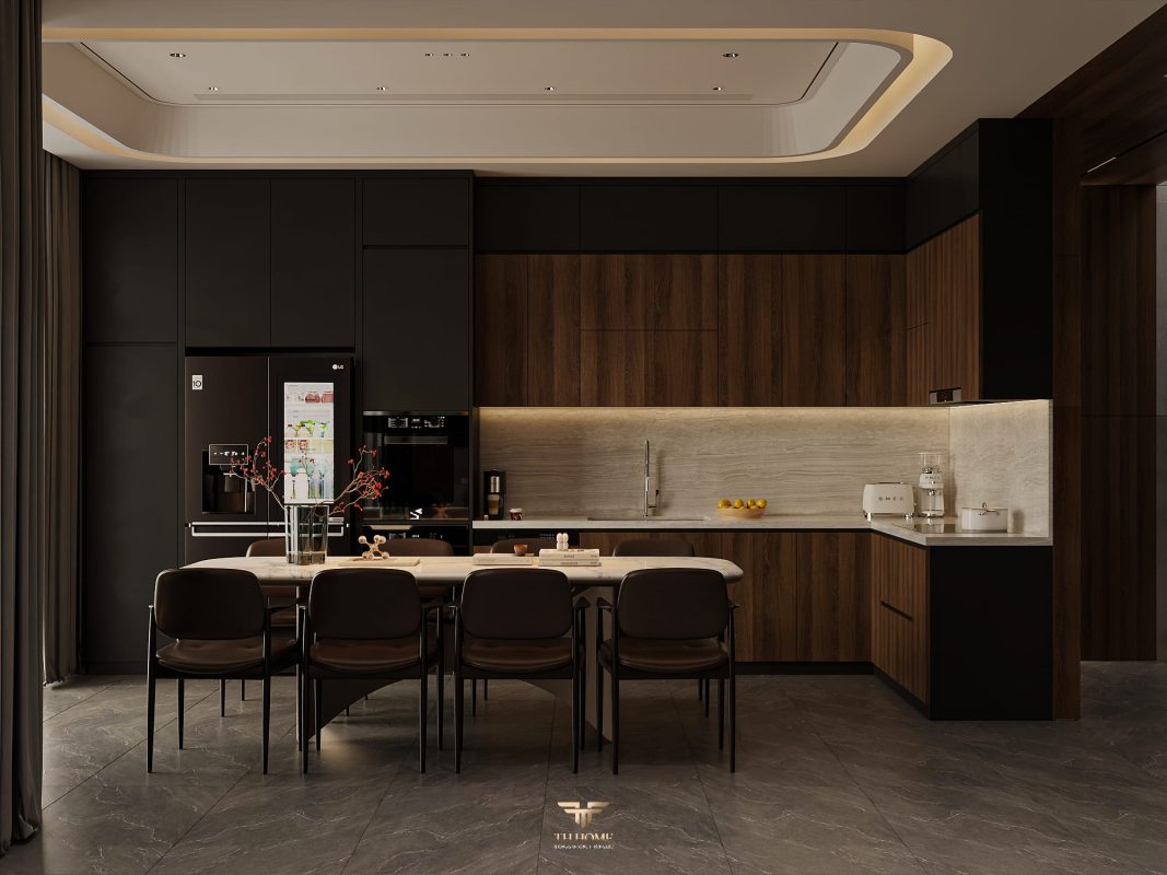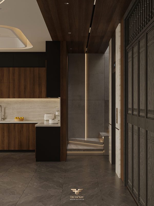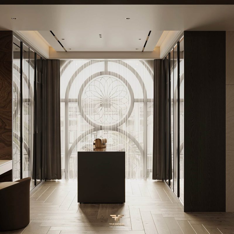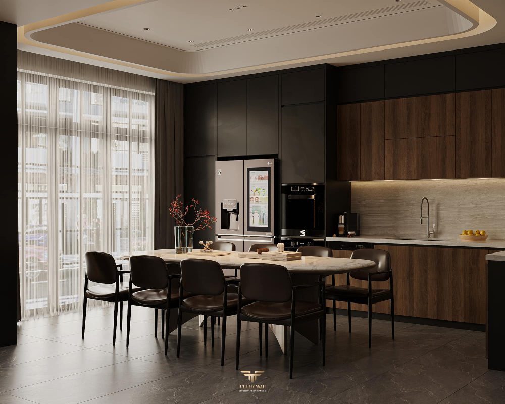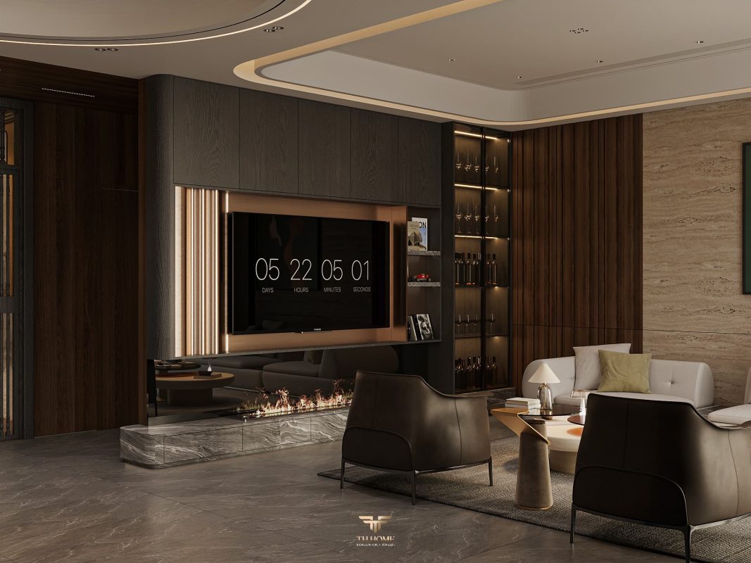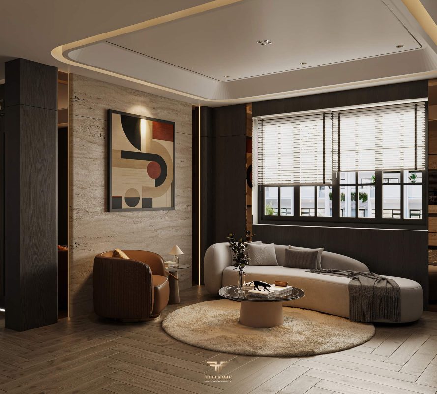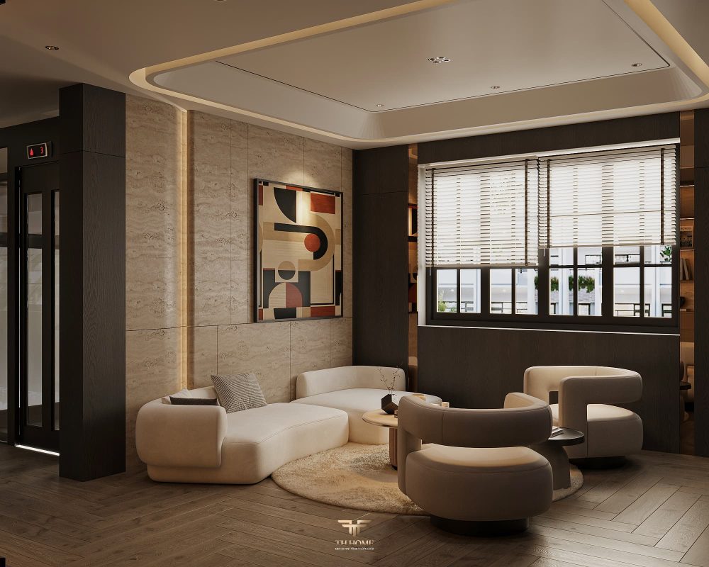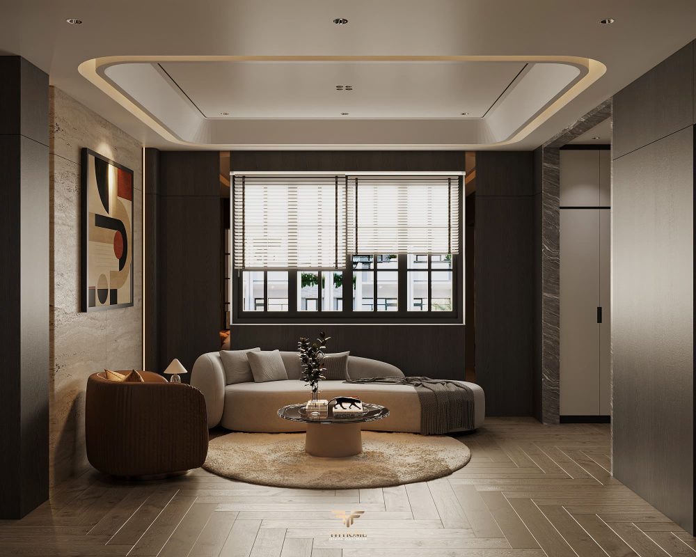 Không gian ấn tượng với tone màu trầm chủ đạo. Từng chi tiết từ trần thạch cao bo cong, hệ thống chiếu sáng cho đến cách bố trí nội thất đều được cân nhắc kỹ lưỡng để tạo nên tổng thể hài hòa: ấm áp, thư thái mà vẫn sang trọng và nghệ thuật.