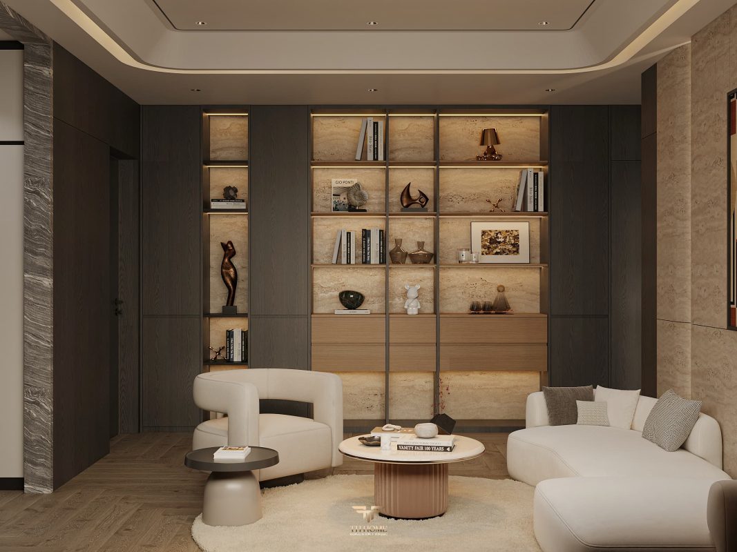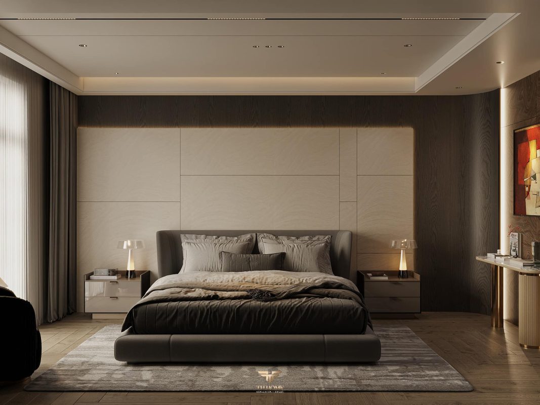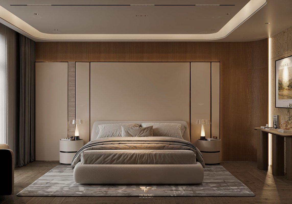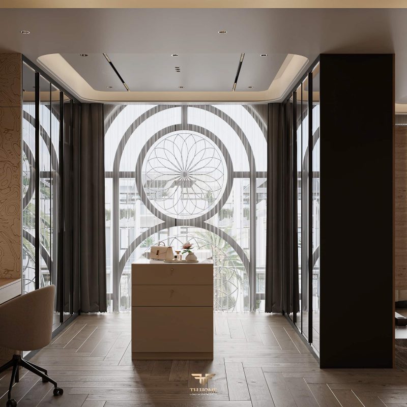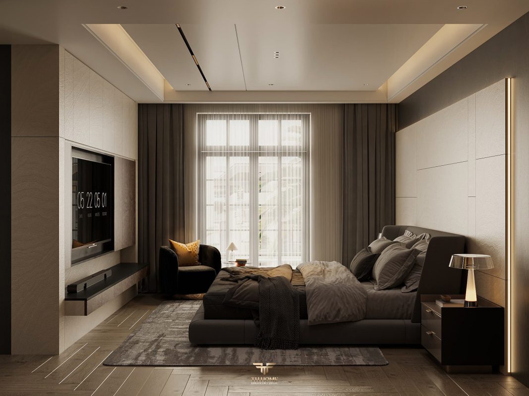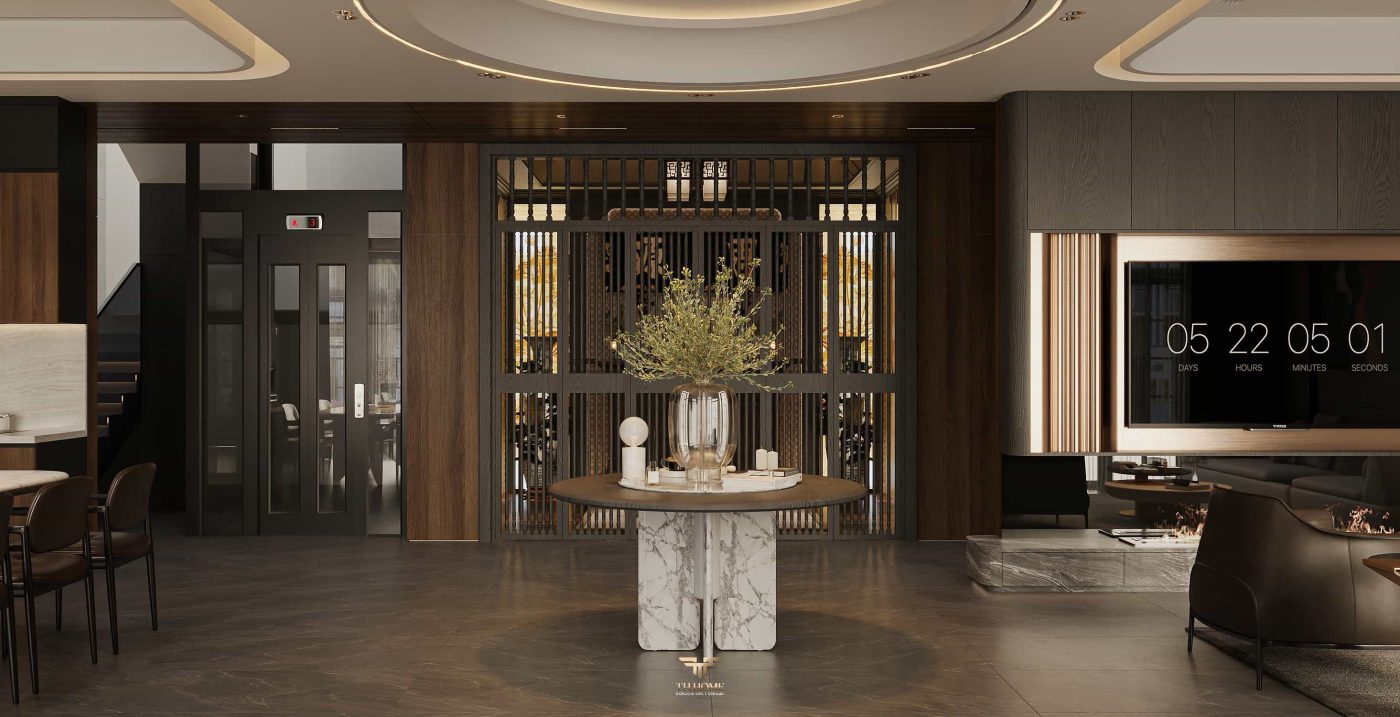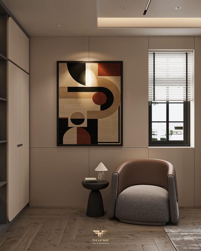 Không gian ấn tượng với tone màu trầm chủ đạo. Từng chi tiết từ trần thạch cao bo cong, hệ thống chiếu sáng cho đến cách bố trí nội thất đều được cân nhắc kỹ lưỡng để tạo nên tổng thể hài hòa: ấm áp, thư thái mà vẫn sang trọng và nghệ thuật.