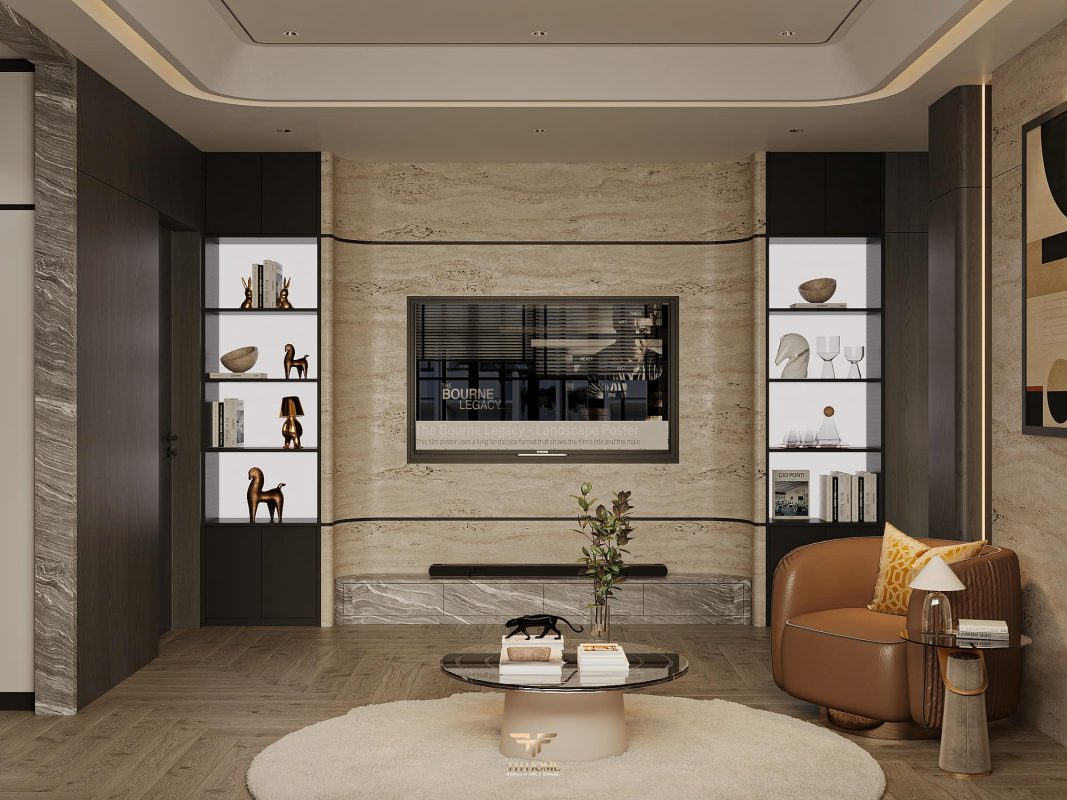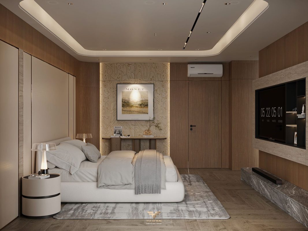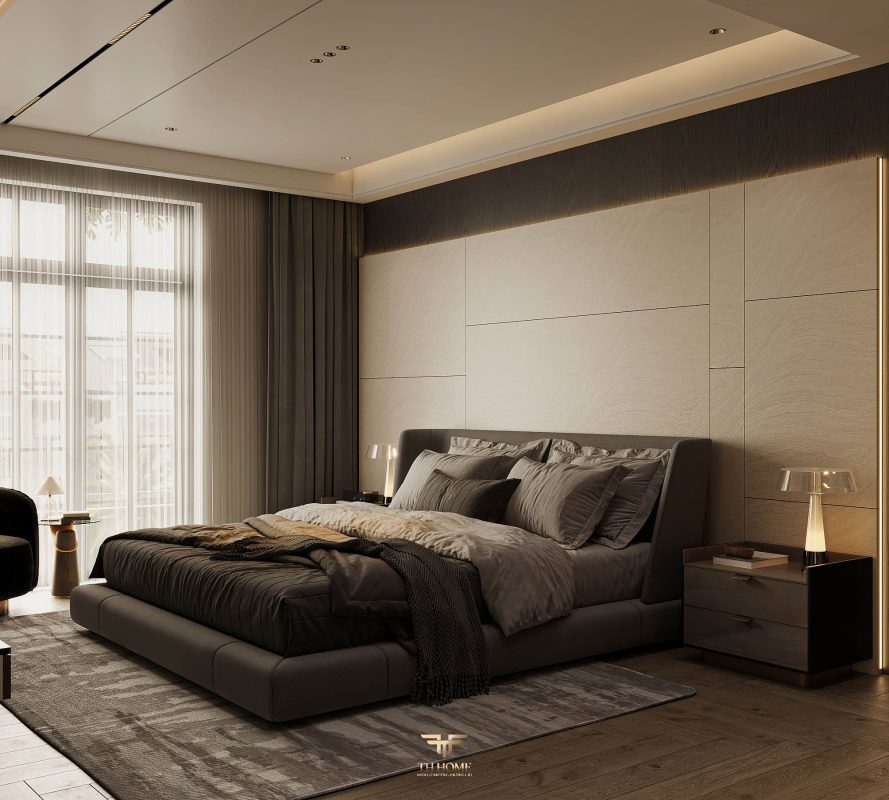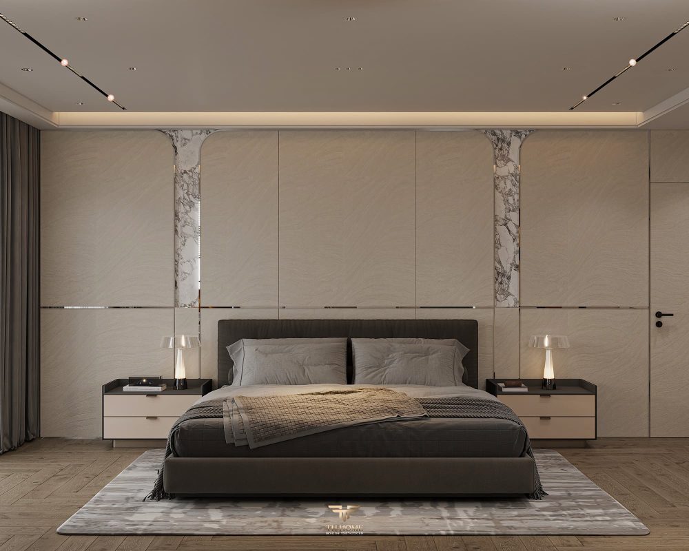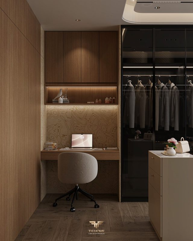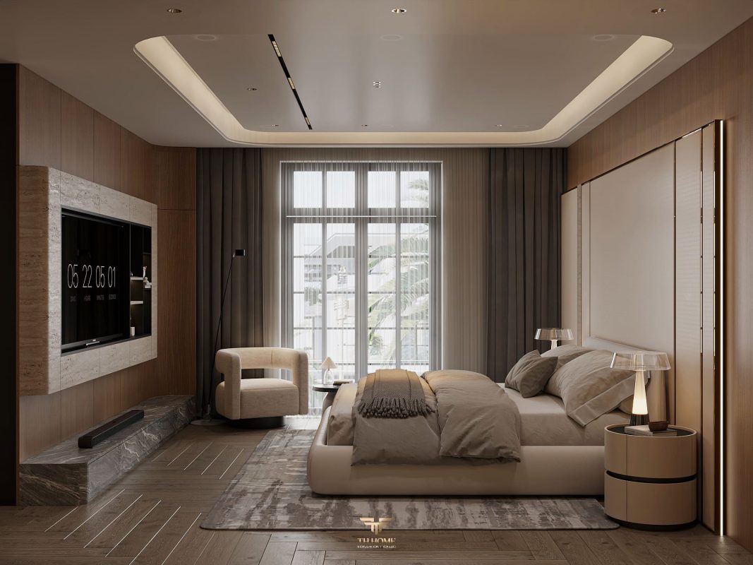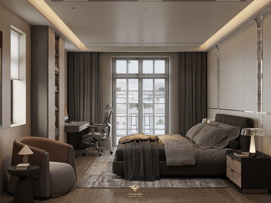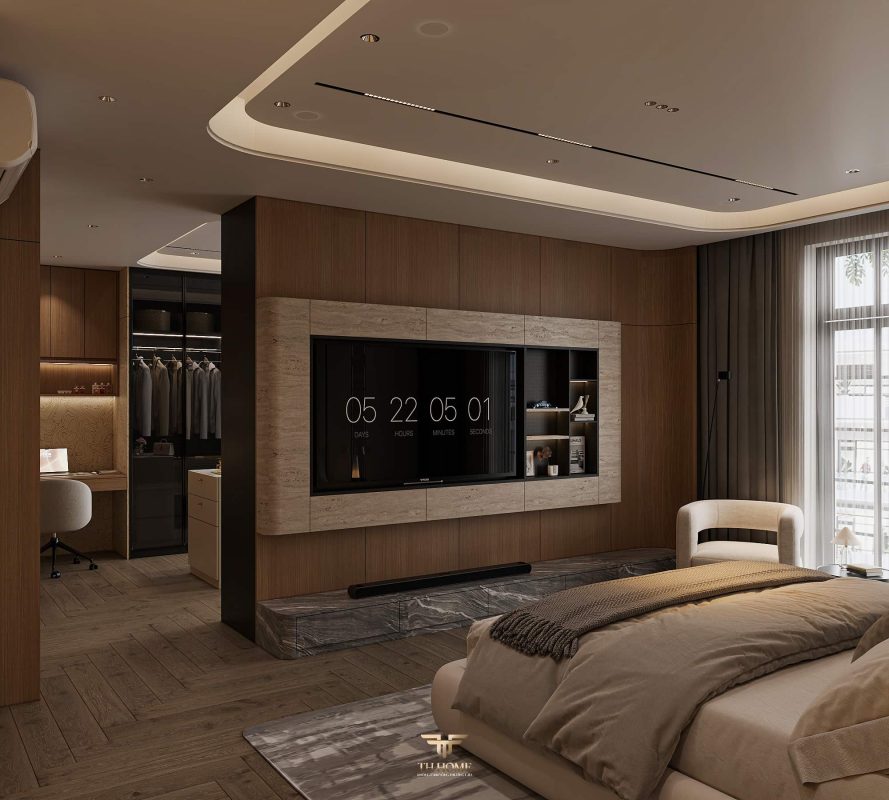 Không gian ấn tượng với tone màu trầm chủ đạo. Từng chi tiết từ trần thạch cao bo cong, hệ thống chiếu sáng cho đến cách bố trí nội thất đều được cân nhắc kỹ lưỡng để tạo nên tổng thể hài hòa: ấm áp, thư thái mà vẫn sang trọng và nghệ thuật.