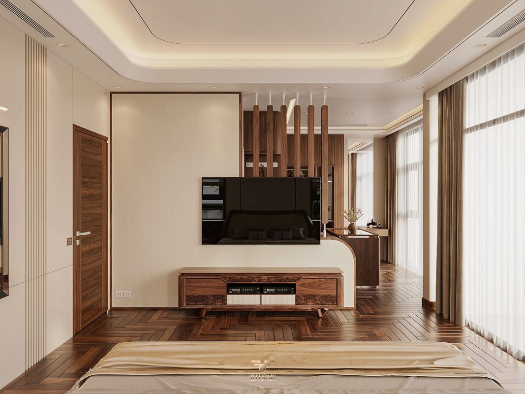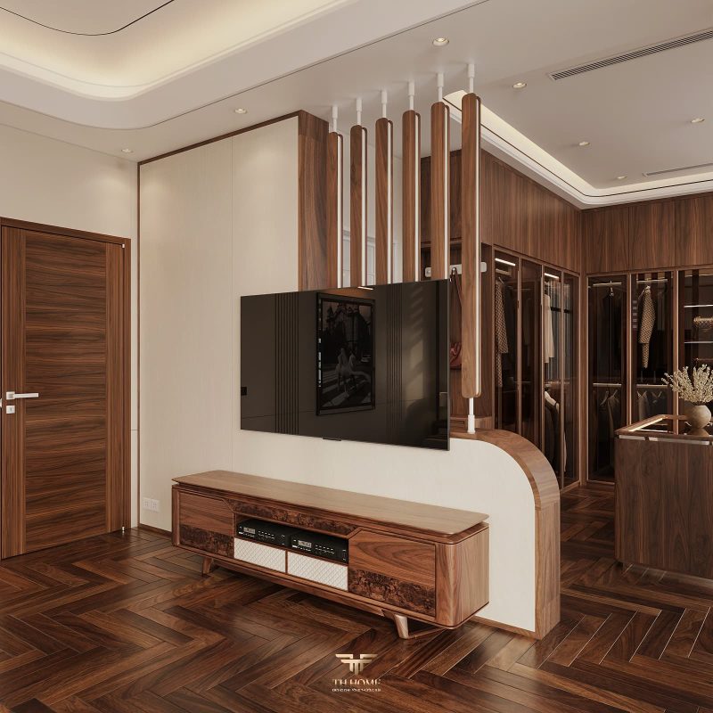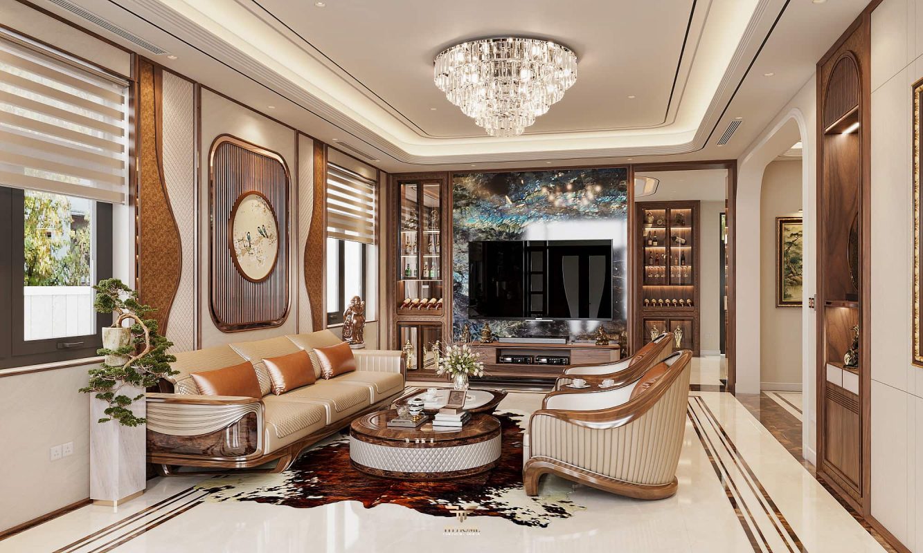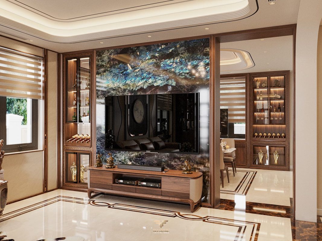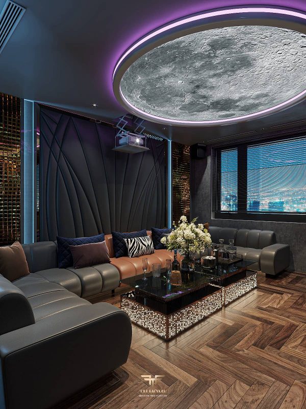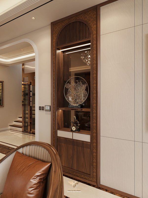 Không gian dẫn dắt cảm xúc bằng gỗ tự nhiên chủ đạo. Dưới ánh sáng được xử lý tinh tế, những đường vân gỗ cuộn xoắn độc đáo hiện lên như những nốt nhạc, kết hợp hài hòa cùng các vật liệu cao cấp: đá xuyên sáng, da, kim loại, kính… tạo nên một tổng thể thanh lịch, trang nhã và giàu chiều sâu cảm xúc.
