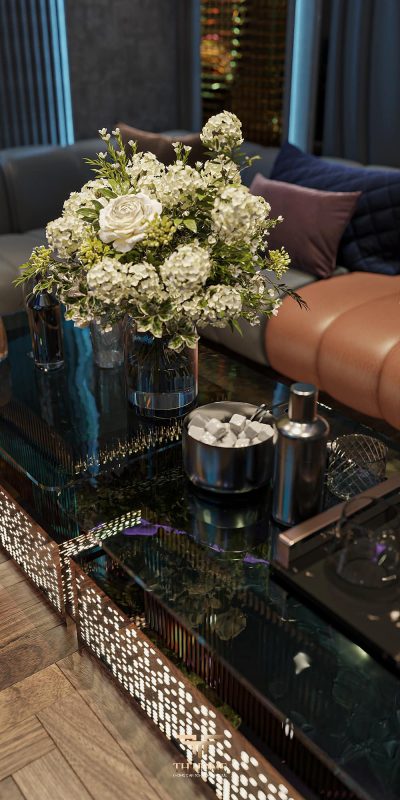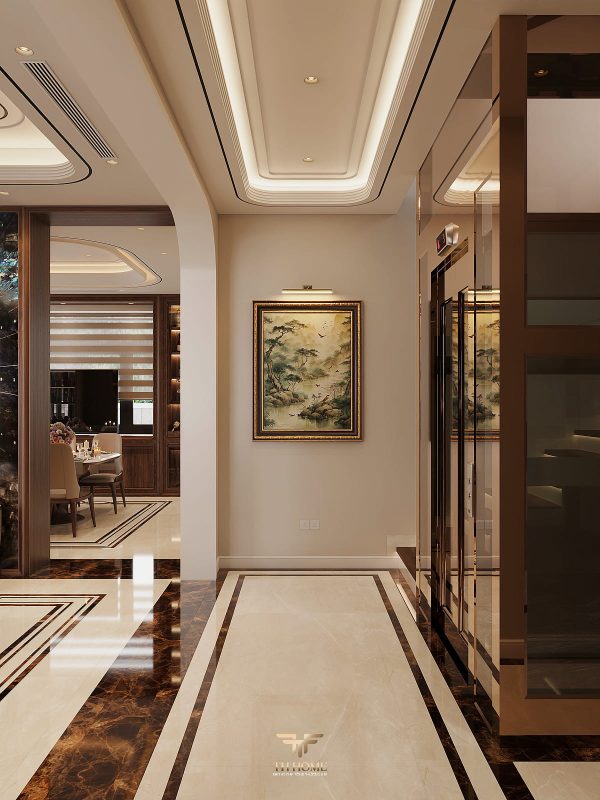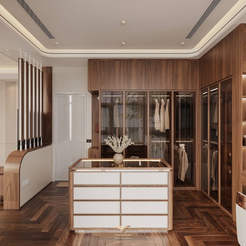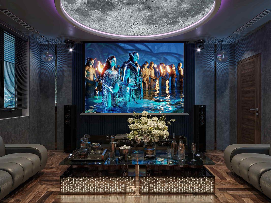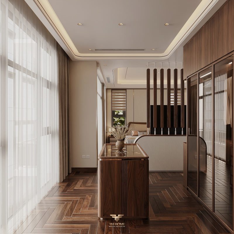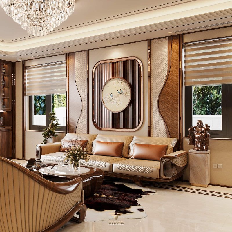 Không gian dẫn dắt cảm xúc bằng gỗ tự nhiên chủ đạo. Dưới ánh sáng được xử lý tinh tế, những đường vân gỗ cuộn xoắn độc đáo hiện lên như những nốt nhạc, kết hợp hài hòa cùng các vật liệu cao cấp: đá xuyên sáng, da, kim loại, kính… tạo nên một tổng thể thanh lịch, trang nhã và giàu chiều sâu cảm xúc.