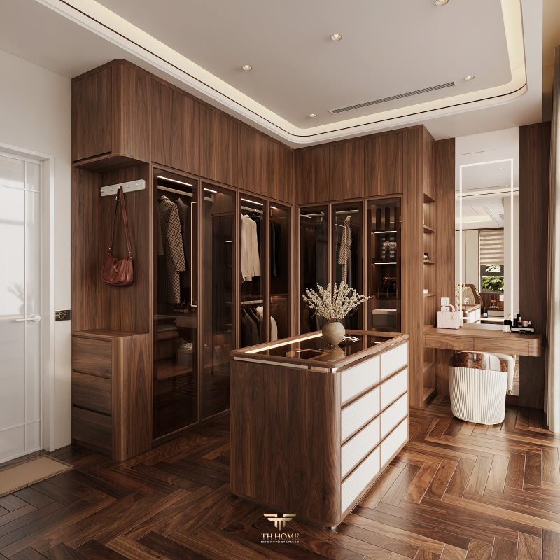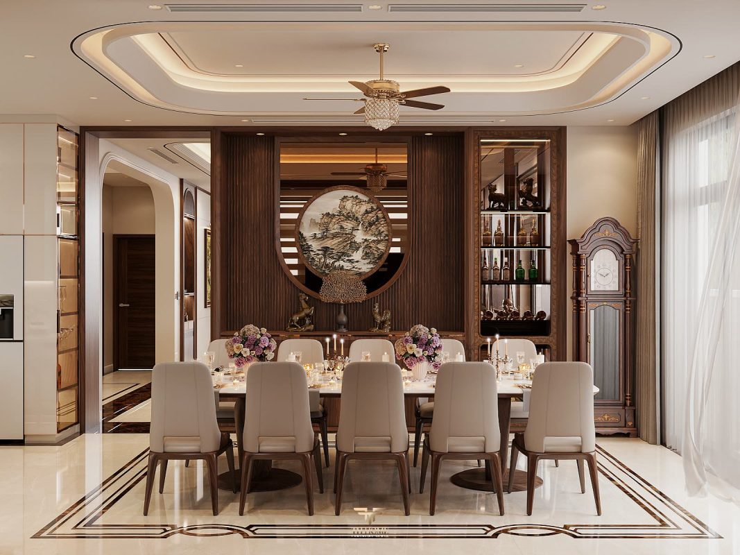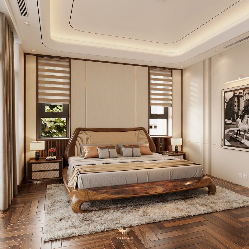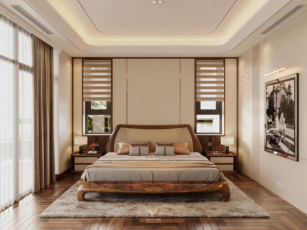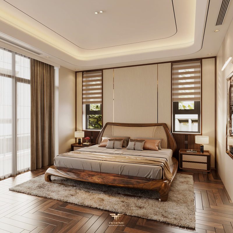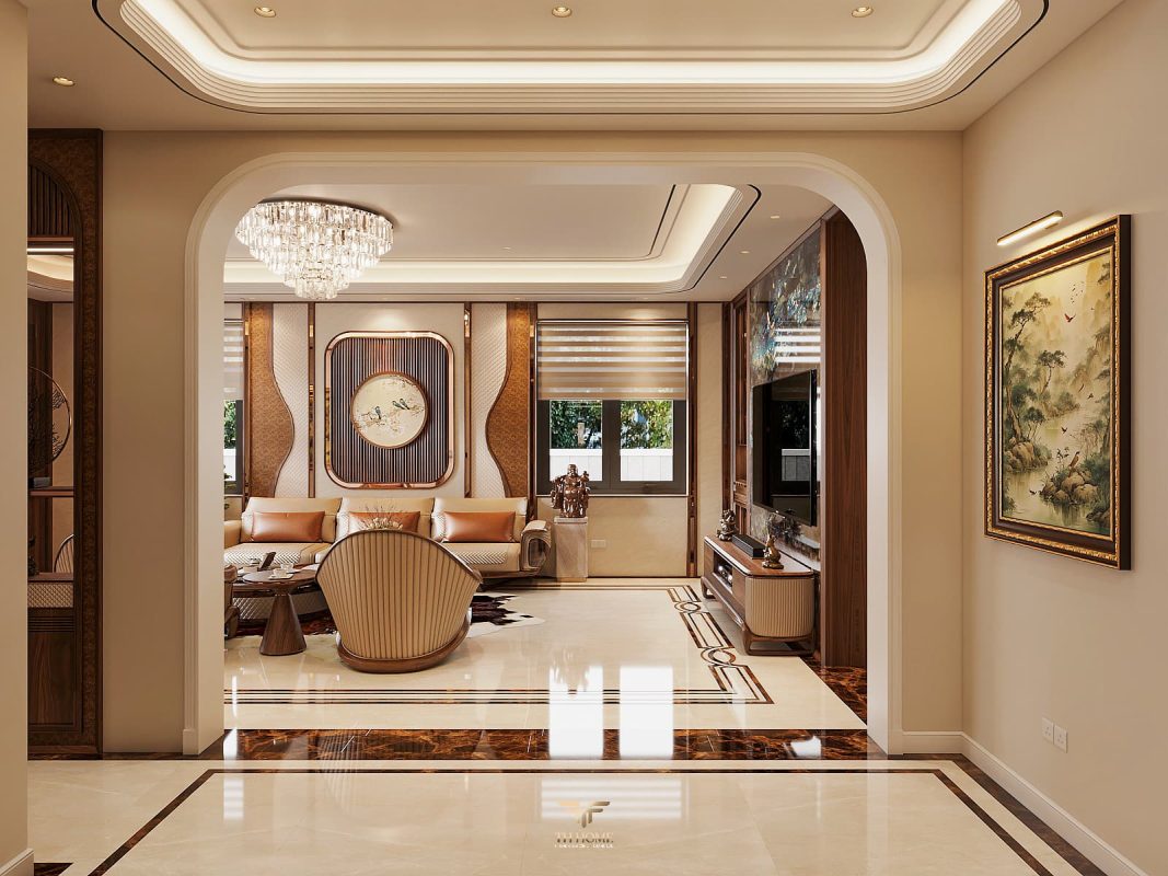 Không gian dẫn dắt cảm xúc bằng gỗ tự nhiên chủ đạo. Dưới ánh sáng được xử lý tinh tế, những đường vân gỗ cuộn xoắn độc đáo hiện lên như những nốt nhạc, kết hợp hài hòa cùng các vật liệu cao cấp: đá xuyên sáng, da, kim loại, kính… tạo nên một tổng thể thanh lịch, trang nhã và giàu chiều sâu cảm xúc.